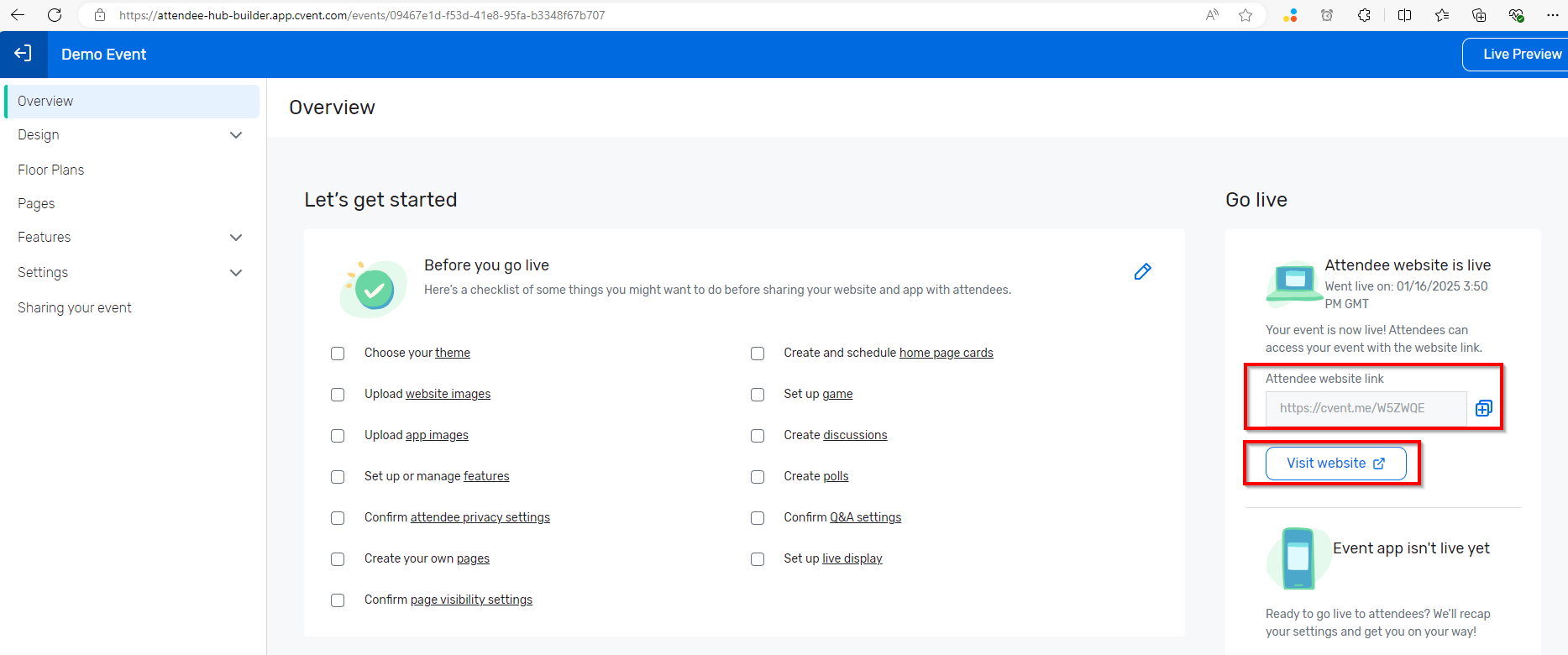 Go to the Attendee Hub section on the menu and click on "Website and App" > "Manage Website and App."