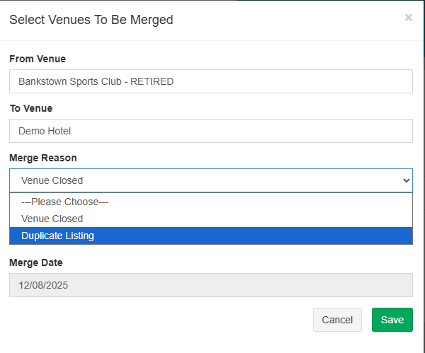A reason for the venue merger will need to be selected. You can choose between Venue Closed or Venue Duplicate.