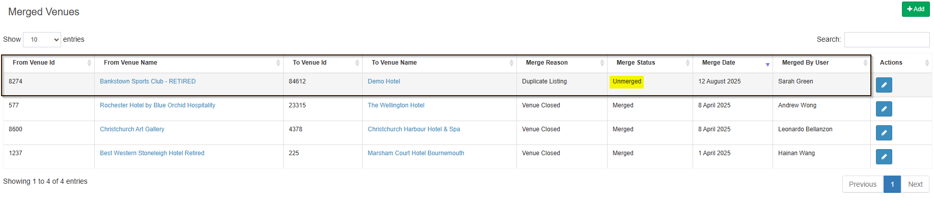 You will then be taken back to the Venue merge homepage, and the merge status will have changed to Unmerged.