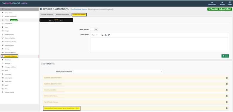 The accreditation must be added to the venue profile in MyEventsChannel, on the Brands & Affiliations tab, within the Accreditation/Awards section.